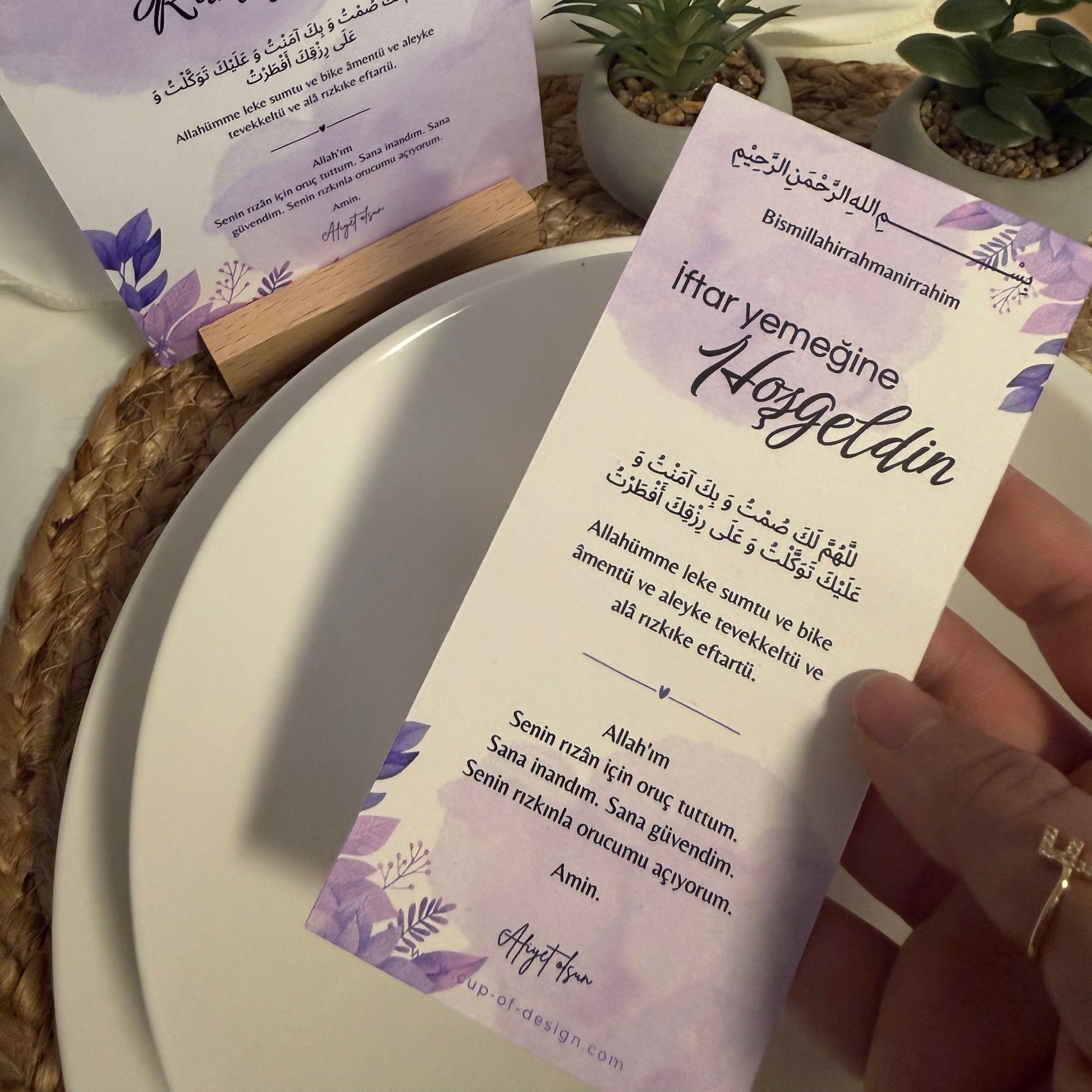 Die Dua-Tellerkarten sind speziell dafür gedacht, direkt am Platz jedes Gastes oder Familienmitglieds zu liegen. Sie erinnern sanft an die Dua vor dem Fastenbrechen und machen den Iftar zu einem gemeinsamen, bewussten Ritual.